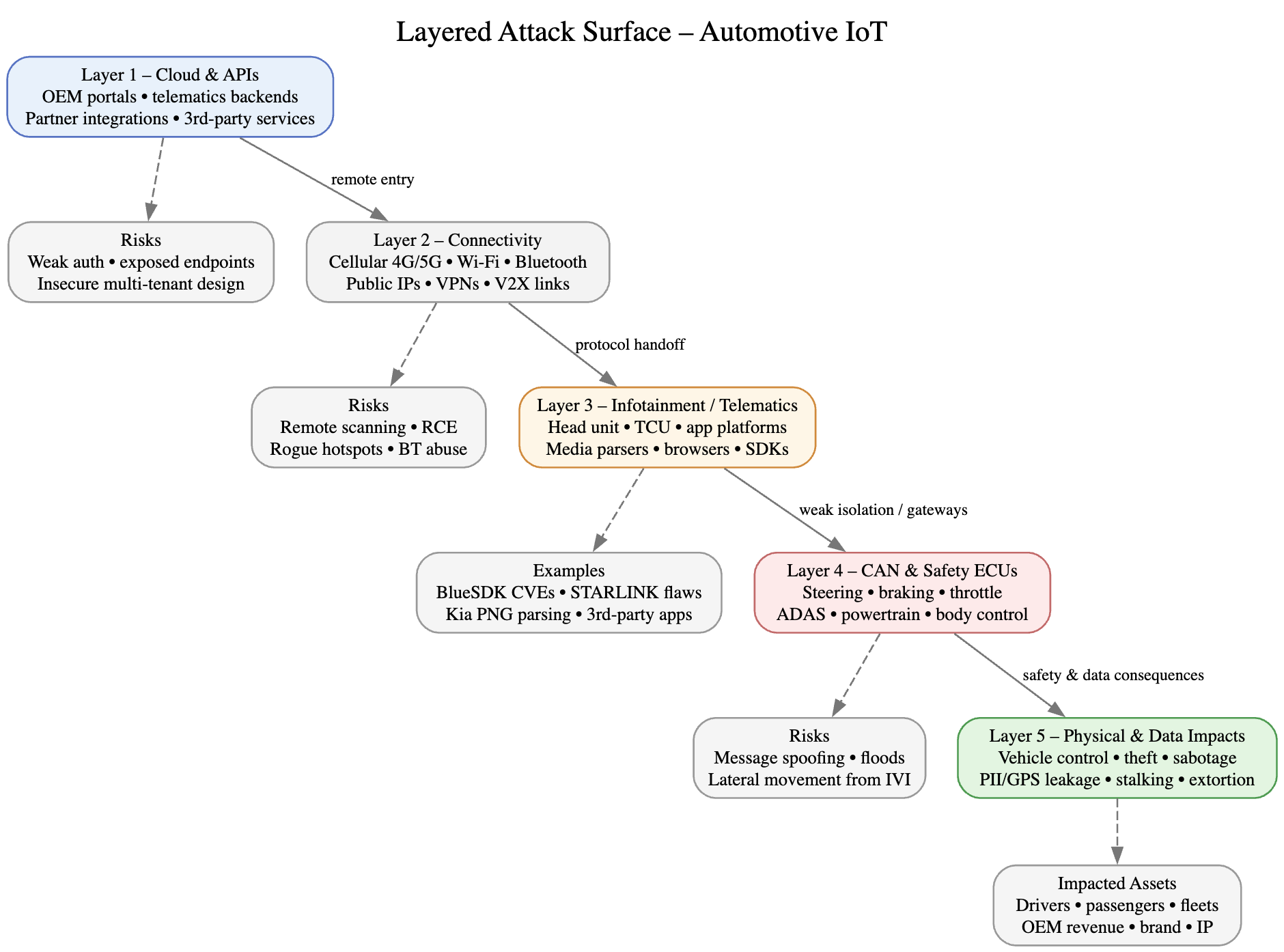 Key point: Internal vehicle networks are often not as compartmentalized as they should be. A compromise in “non-safety” parts (like telematics or infotainment) can escalate into direct safety impact.